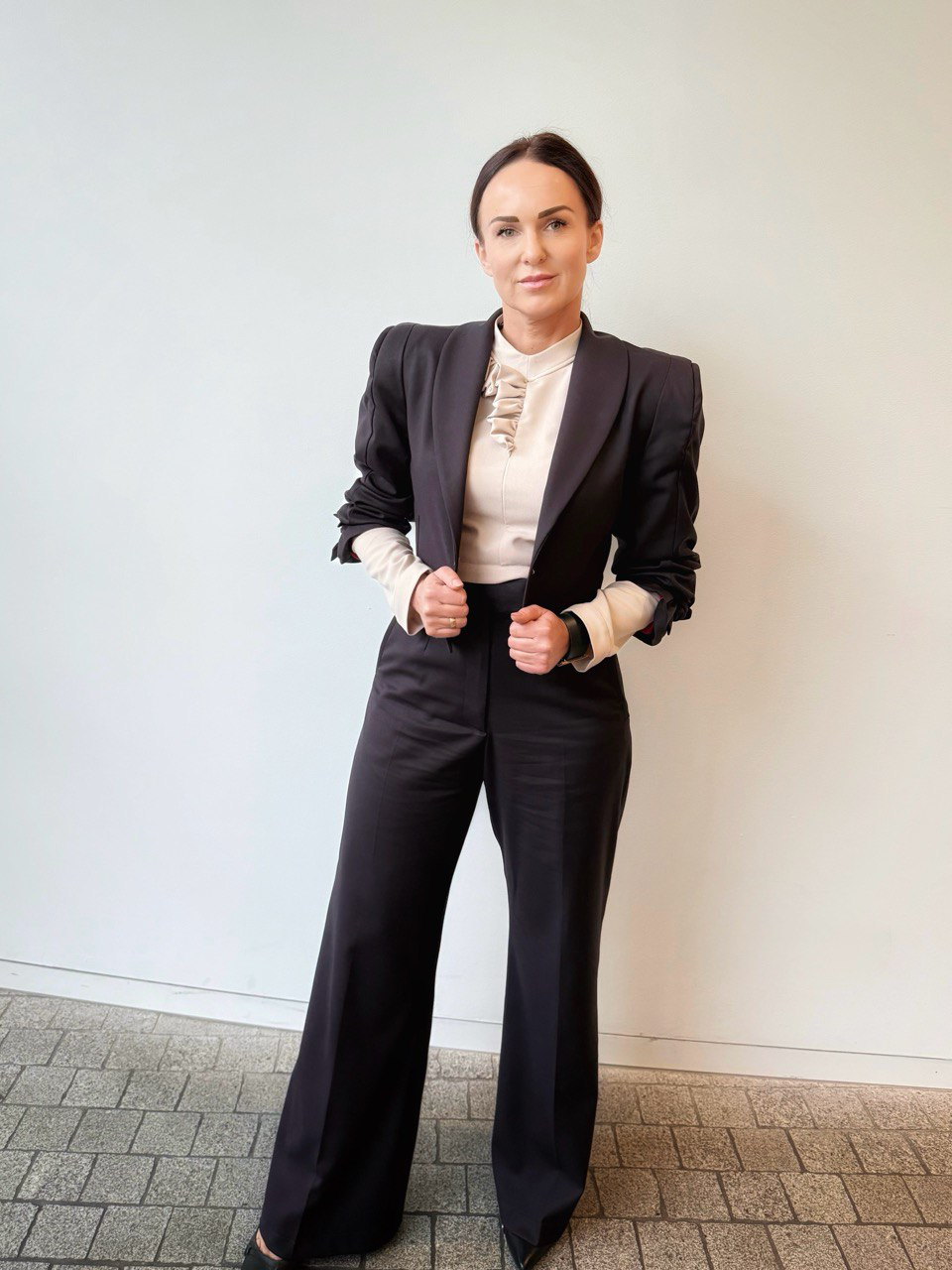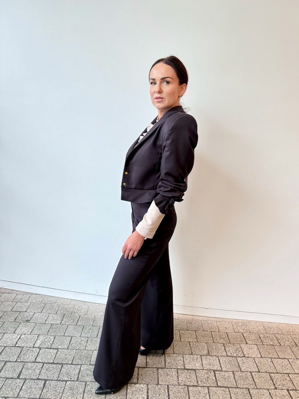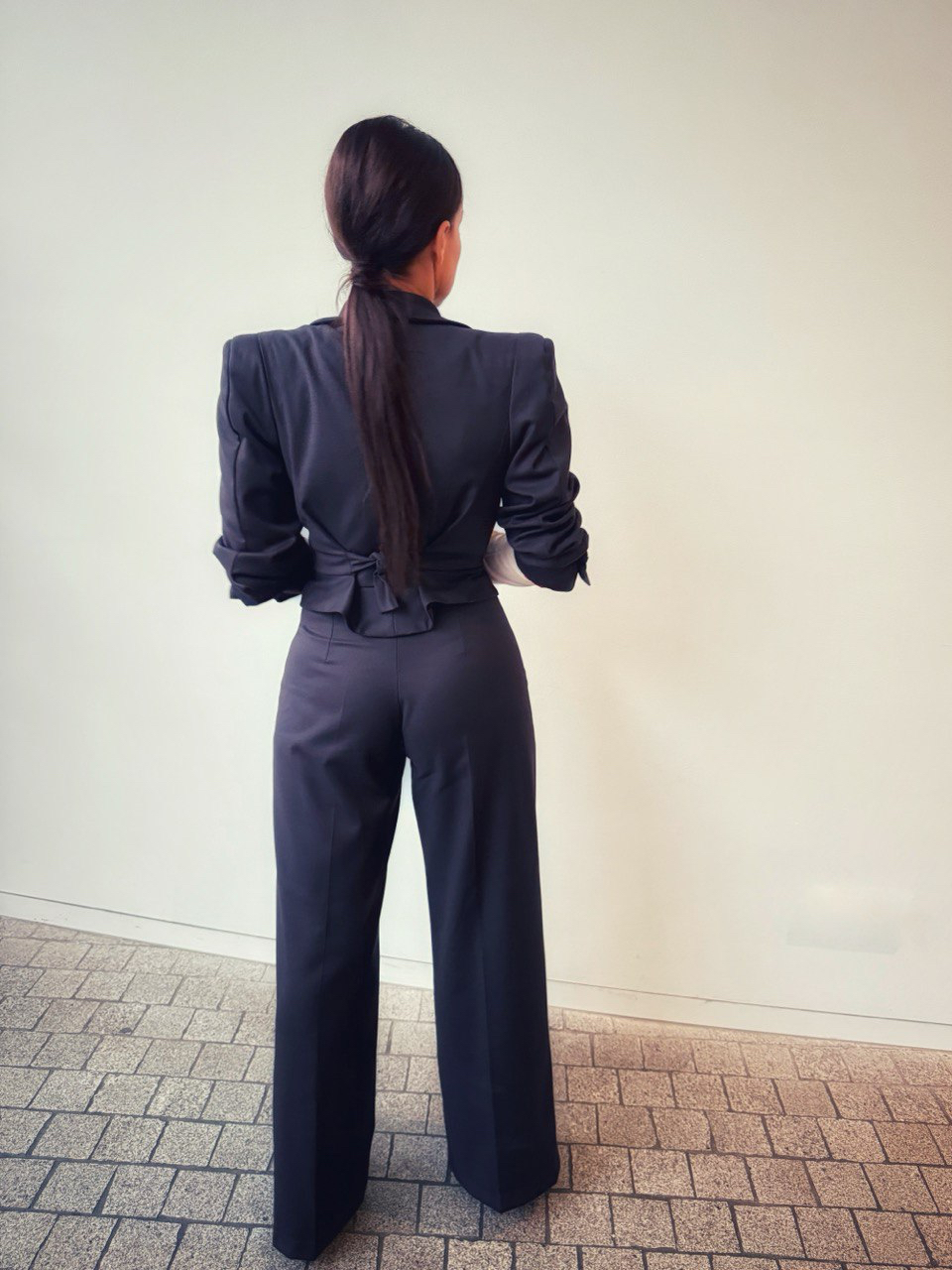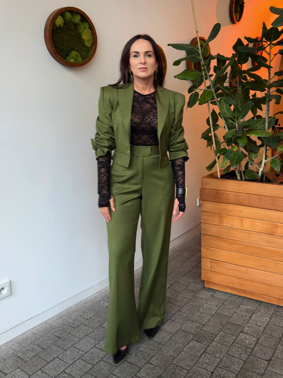 Spodnie z wysokim stanem, subtelnie rozszerzaną nogawką i zaprasowanym kantem budują sylwetkę prostą, mocną i elegancką. Konstrukcja wydłuża nogi, porządkuje proporcje i nadaje całości wyrazistości bez nadmiaru formy.